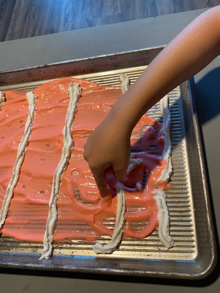 -Peppermint cream letter practice: While technically not candy cane, this activity fit the bill and my littles both loved it! You just mix some peppermint extract and red food coloring in Cool Whip (we used spray whipped cream and it was waaaay too runny) then spread it on a cookie sheet. You can add in white stripes or swirls if you like! Then call out each letter and have your little practice writing it in the cream- they can lick their finger between each number for incentive of course!