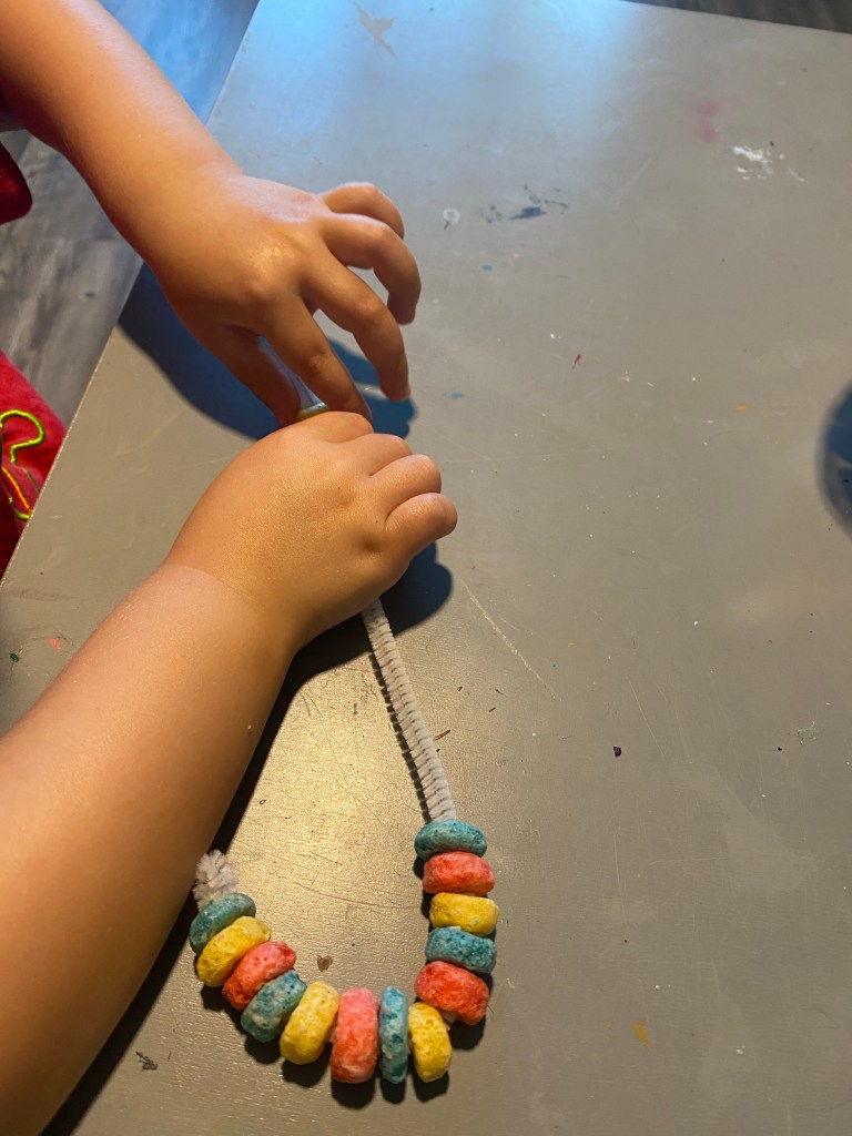-Candy cane pattern building: For this activity I had my littles thread Fruit Loops on pipe cleaners to make repeating pattern. I got this idea from My Joy Filled Life.