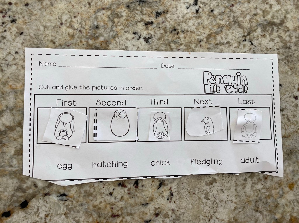 -Penguin life cycle: We printed, cut out and put together this worksheet on the Lifecycle of Penguins. I got it from Teachers Pay Teachers for free!