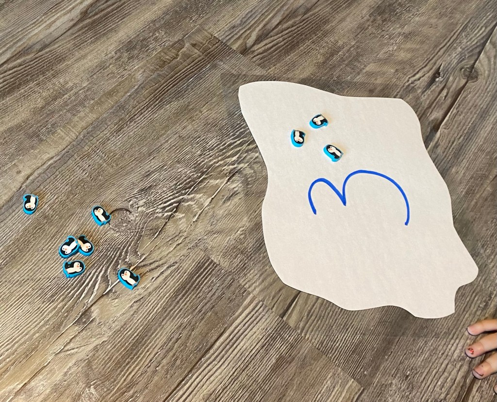 -Iceberg and penguin counting: I gave my littles “icebergs” with the numbers 1-10 on them. I had them identify each number, then count that many penguins to put on the iceberg. If you have a set of tiny penguin erasers (they came with polar bears and snowflakes a few years ago at Target) you can use those but if not, black pompoms will work in a pinch or penguin cut outs!