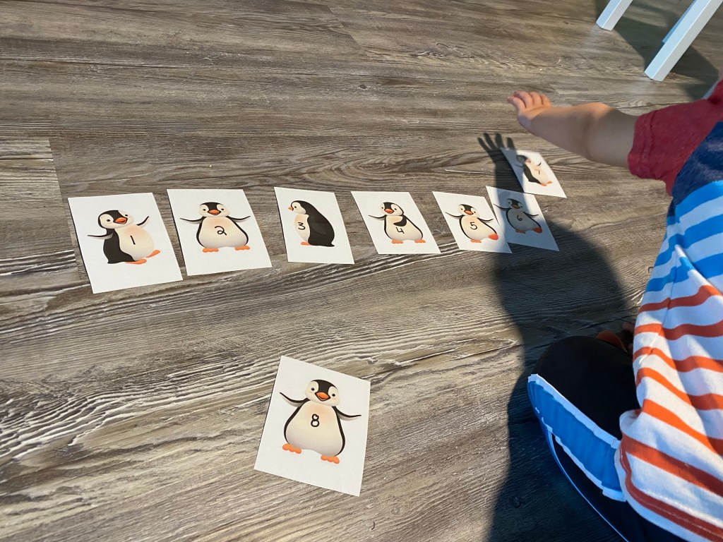 -Penguin number ordering: I printed these cute little penguins then wrote the numbers 1-20 on their tummies. Then I laminated them and cut them out. I had my 3 year old order the numbers 1-10 and my 5 year old add on 11-20.