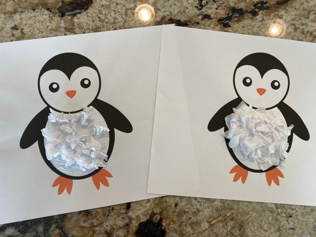 -Fuzzy tummy penguins: These are so cute and work on fine motor skills as well as art! I printed some cute penguins, then gave my littles 1 inch squares of white tissue paper to crumple up and glue to their tummies. I got this idea from Pinterest.
