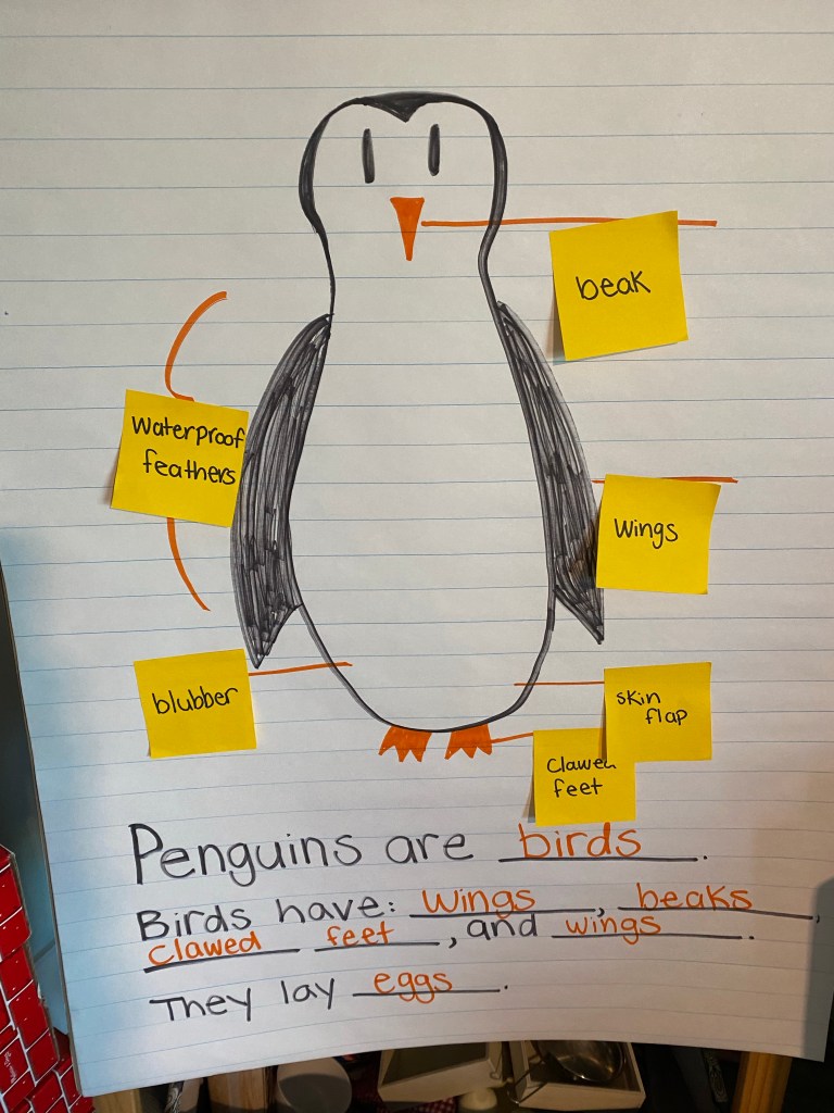 -Penguins are birds diagram: I drew and penguin on chart paper, then wrote the parts on sticky notes with lines pointing to each part on my picture. Then I had my littles take turns labeling the parts (which they find quite fun!) Next we reviewed the features of all birds and wrote them on the chart too.