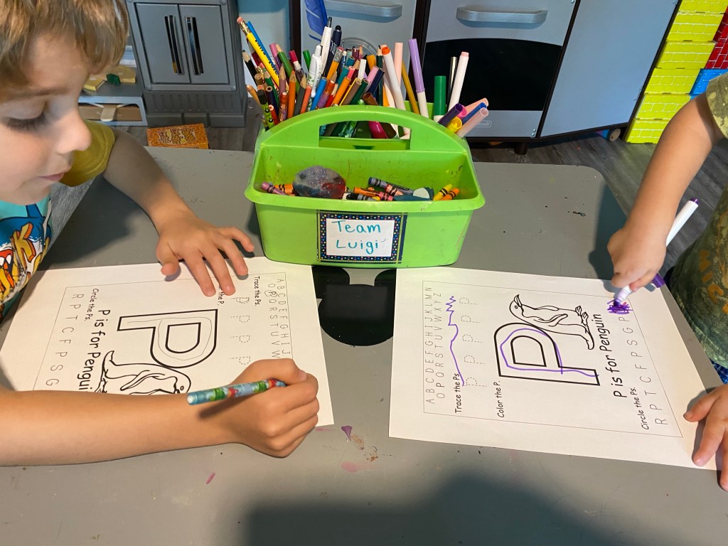-P is for penguin writing practice: I printed this “P is for Penguin” writing page and had my littles identify and practice writing their Ps (my 3 year old just did the big one).