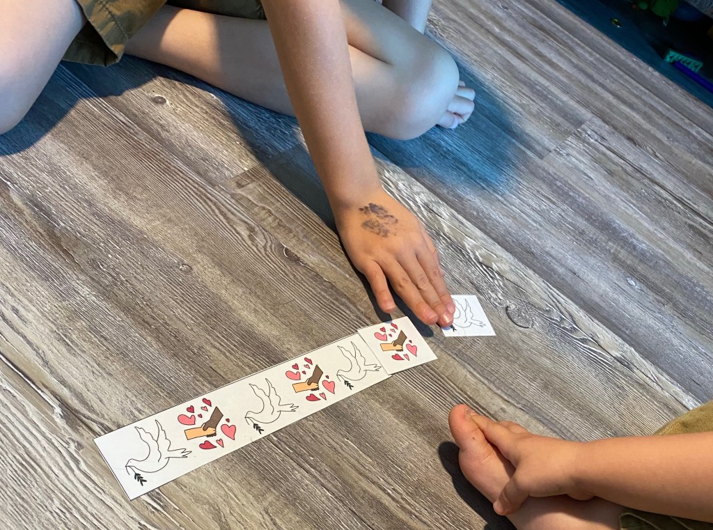 -Dove of peace word problems/number line practice: I introduced how to use a number line to add and subtract to my little, then helped him read the word problems on this dove of peace word problem page. Then he used the number line to figure out the answers.