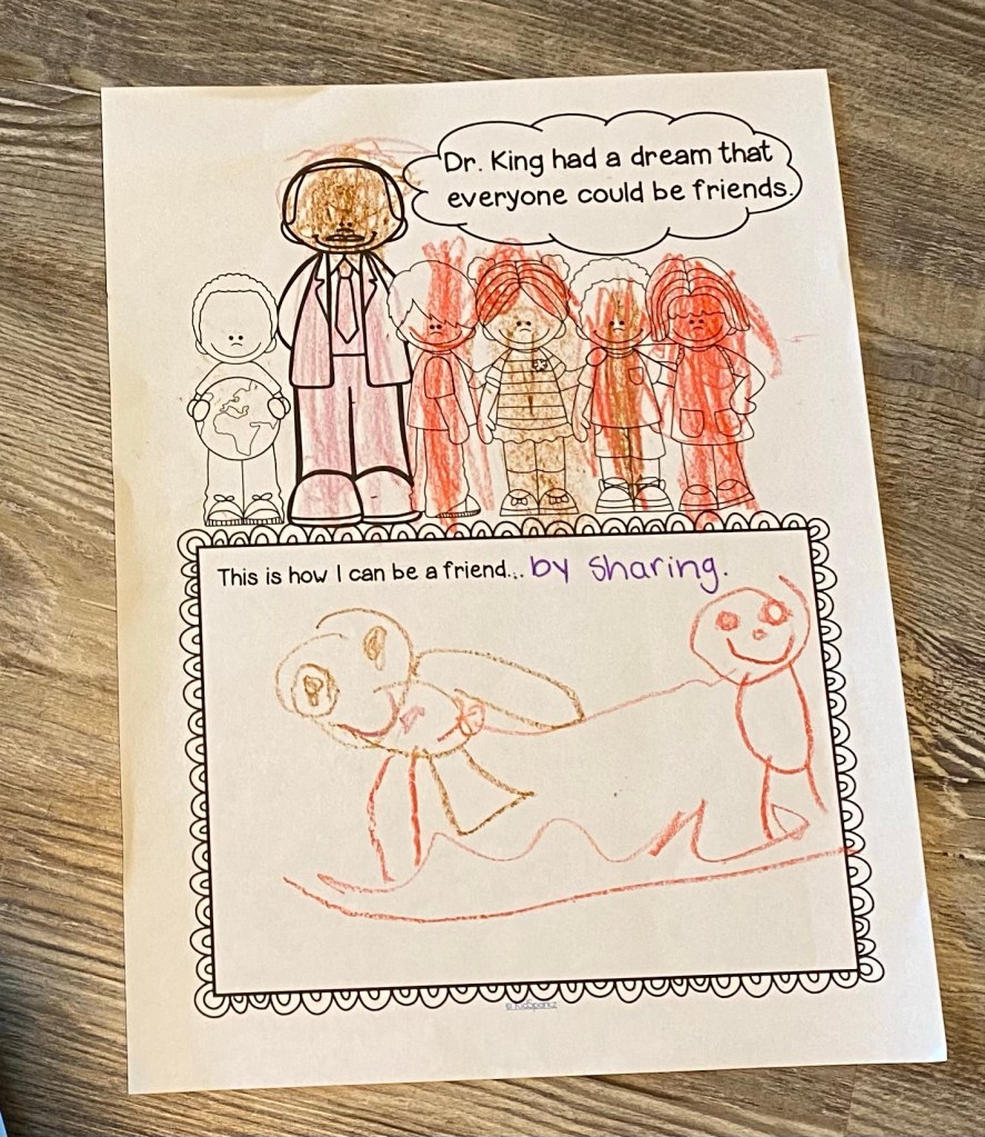 -How I can be a friend drawing: We discussed how Martin Luther King Jr. wanted everyone to be friends, and talked about some ways we can show that we’re a good friend to others. Then I had my littles illustrate one of the ways on an MLK themed “I can be a friend” drawing page.