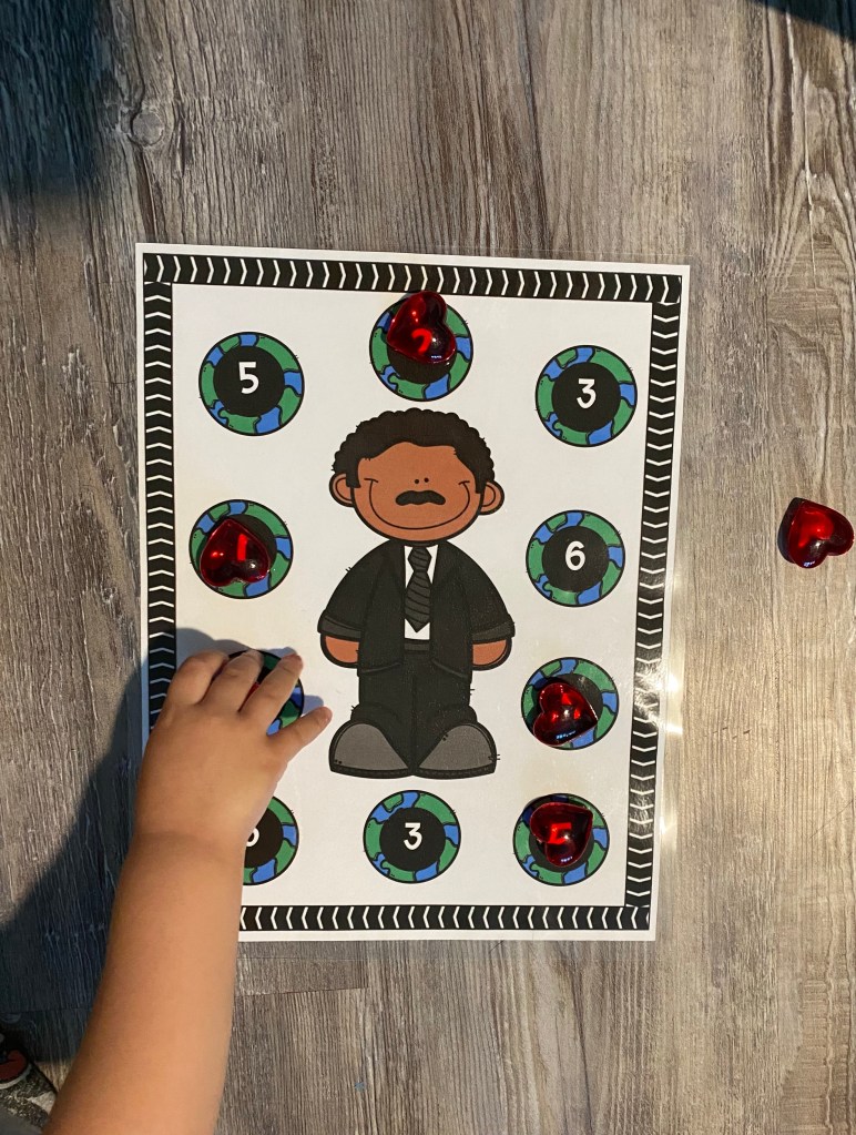 -MLK roll and cover: I printed this MLK themed roll and cover game, then had my littles take turns rolling a dice and covering the number they got with heart beads.