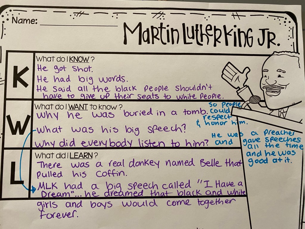 -MLK KWL: A KWL chart is a great way to access little’s prior knowledge before you add on to it in a unit. It stands for Know, Want to know, and Learned. Basically before a unit of study, you ask your little what they already know about the subject. Then ask them what they’d like to learn. At the end of the study ask them what they did learn. We did this using a MLK themed KWL printable from Teachers Pay Teachers.