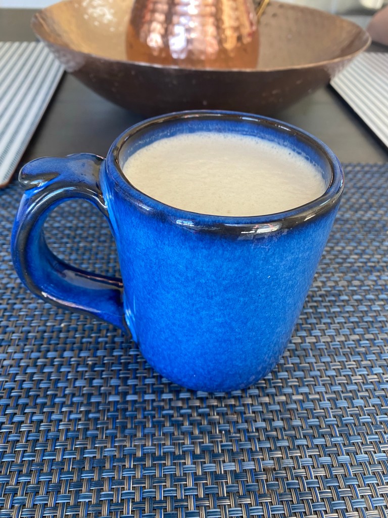 -Tibetan tea tasting: I have always been curious about what yak butter tea- a staple of the Tibetan diet- tastes like, so I found a recipe on Food and Wine’s website. Obviously we don’t have any Naks around (I was today years old when I learned that’s what a female yak is called!) so I used gee (aka clarified butter from cows), whole milk, black tea and salt to make my butter tea. To brew it I steeped black tea in a cup or so of boiling water for about 5 minutes, poured it in my bullet blender with 1 tsp gee, 3-4 twists of the salt grinder and a splash of whole milk then blended it (it’s traditionally steeped for half a day and then shaken up with the butter and milk or cream, but I was on a time crunch!) The result was a frothy, rich, slightly salty and buttery flavored tea that was actually quite delicious!