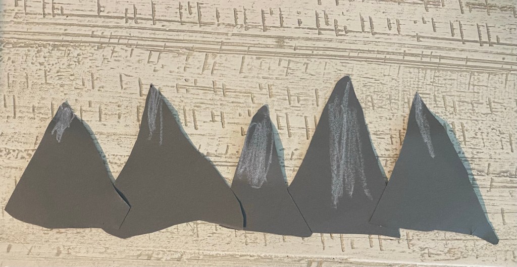 -Mountain range cutting practice: I had my littles each cut out some triangles from grey paper, then tape them together on the back and color the tops white to make a snowy mountain range!