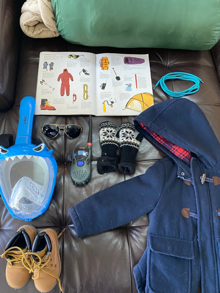 -Gather items needed to climb: You’d be surprised at the amount of “climbing gear” you probably have around your house (even if it’s not the true high tech stuff they use on the mountain). We looked at the list in “Top of the World” and then I had my littles go on a scavenger hunt around the house to see how many of the items (or close to them) they could find.
