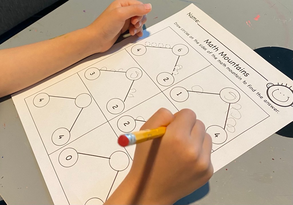 -Math mountains ie. number bonds: This is a recent strategy for teaching adding- you write the two addends in the bottom circles, draw dots or O’s on each side to match the numbers then write your answer at the top (ie. the two bottom numbers are “bonded” or added together to make the top number). I got some practice worksheets on this at Teachers Pay Teachers. There were 3 of these so you can do them on more than one day to practice!