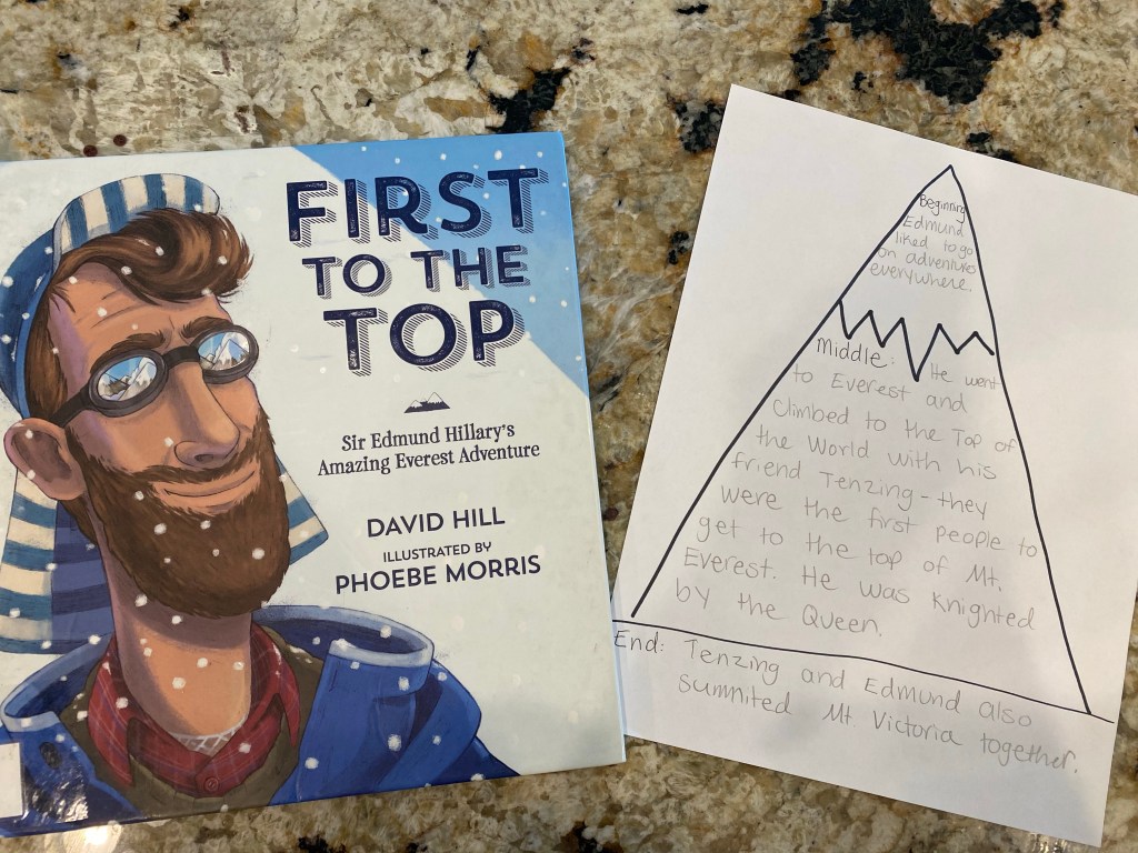 -Mountain retelling graphic organizer: I drew a mountain with beginning at the top, middle in the middle and end at the bottom. Then we read a story about Sir Edmund Hillary (one of the first two men to summit Everest) and I had my little tell me what happened in the story. I wrote down his thinking on the mountain.