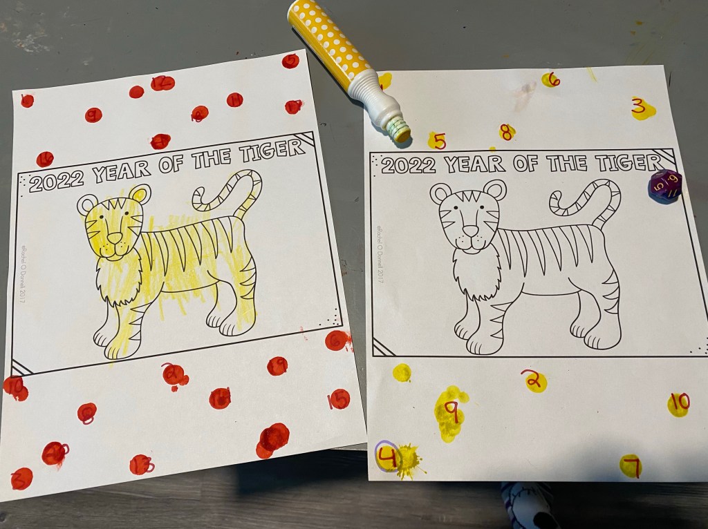 -Year of the Tiger roll and cover: I printed out a Year of the Tiger coloring page then wrote the numbers 1-10 on my 3 year old’s copy and 1-20 on my 5 year old’s. Then I had them roll 10 and 20 sided dice, identify the number they rolled, then find and dot it on the page.