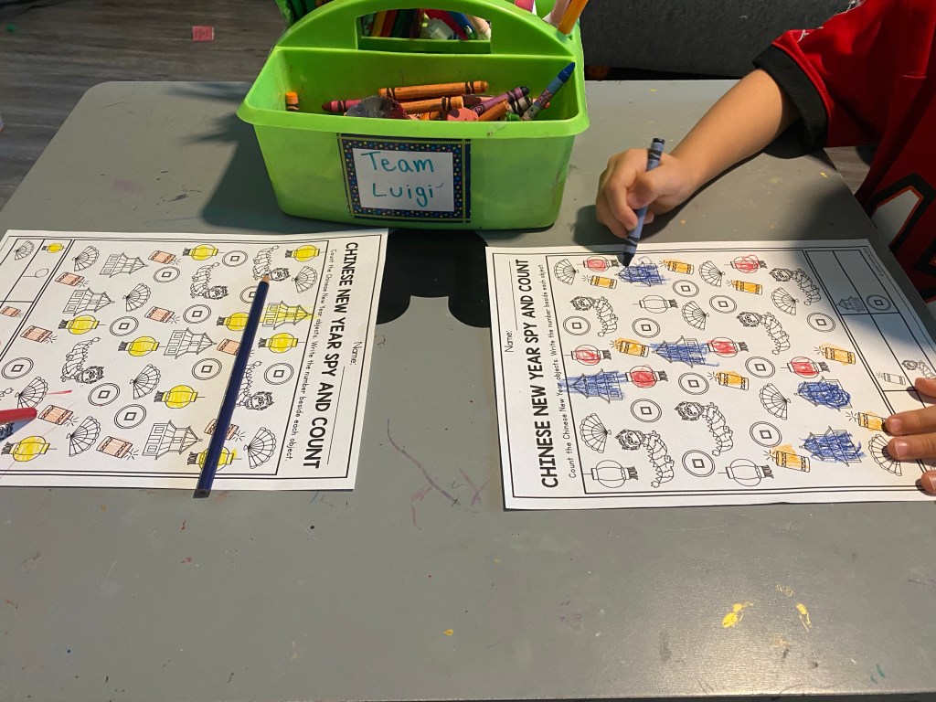 -Chinese New Year spy and count: I printed this CNY spy and count activity from Teachers Pay Teachers then had my littles find and color each item a different color. Then they counted each item.