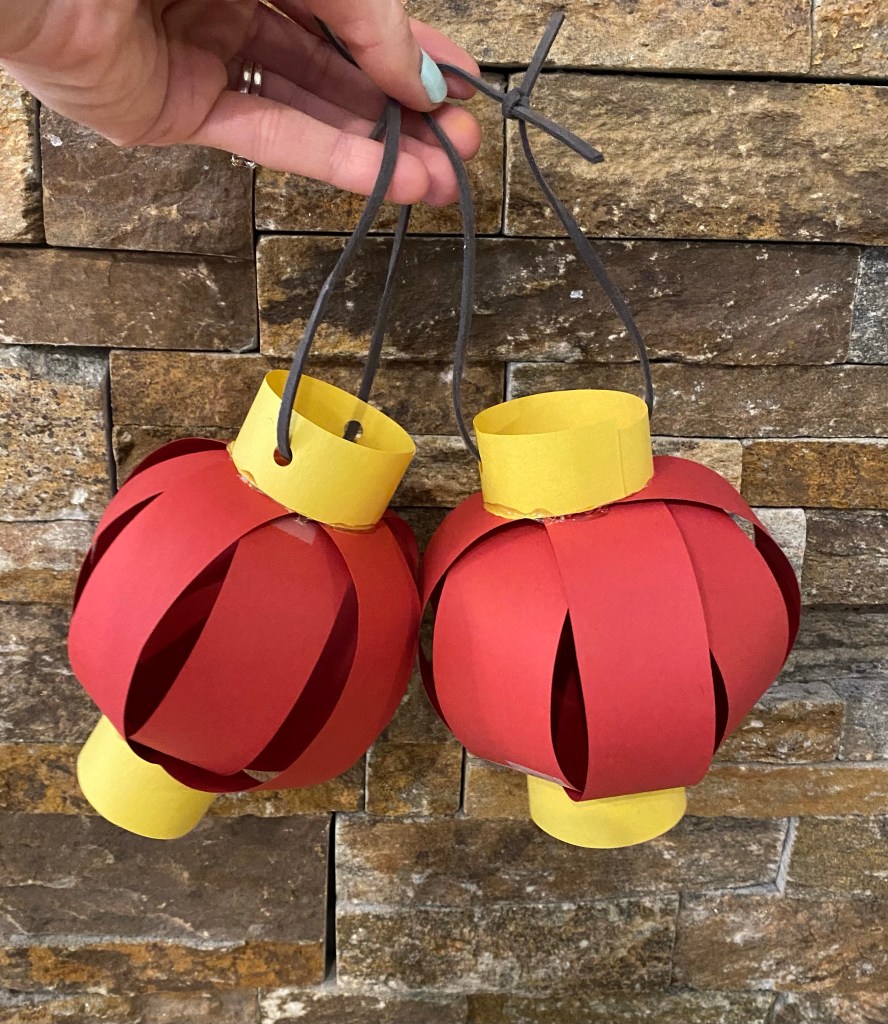 -Round paper lantern craft: We made round paper lanterns by taping strips of red paper in circles around each other (the picture explains it best!) I held the paper while my littles did the taping. Then I hot glued yellow paper circles on the top and bottom, hole punched each side of the top one and strung a string through it so we could hang them up!