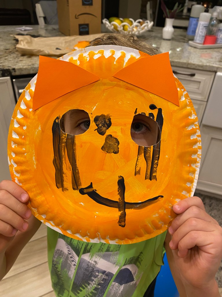 -Paper plate tiger mask: Since it’s the year of the tiger this year, I had my littles paint some paper plates orange with black stripes. Then I cut out eye holes for them and put them on sticks so they could use them as masks! I got the mask idea from Happy Toddler Playtime.
