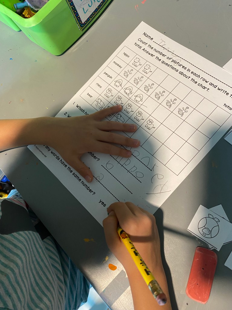 -Word of the week: will, each day we do a different activity focused on our word- introduction/sound the word out/have your little practice writing it on the chalkboard or whiteboard, word family list- think of other words that rhyme with your word of the week, use the word in a sentence (have your little come up with the sentence and write it for them) then have your little illustrate the sentence, and workpage practice.