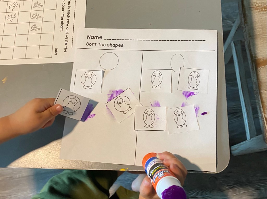 -Shape sort: My 3 year old worked on this oval vs. circle shape sorting activity while my 5 year old completed the activity above. This activity and the three below it all came from this animal math activity pack from Teachers Pay Teachers. There were a ton of activities in the pack- you could really use it all week!