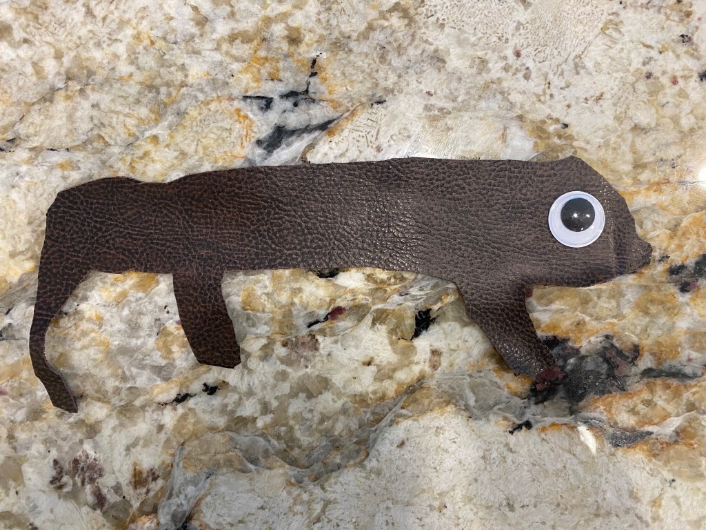 -Cut out a reptile: I gave my 5 year old a piece of faux leather to represent animal scales (though now that I think about it, leather usually comes from cows… lol Oh well!) with a lizard drawn in white crayon on the back. He cut the lizard out, then added a googly eye to finish the project.