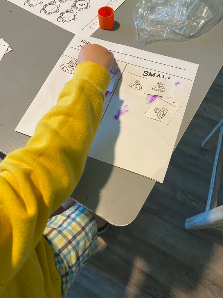-Big or small sorting: While my 5 year old worked on the activity above, my 3 year old did this smaller and larger sorting activity.