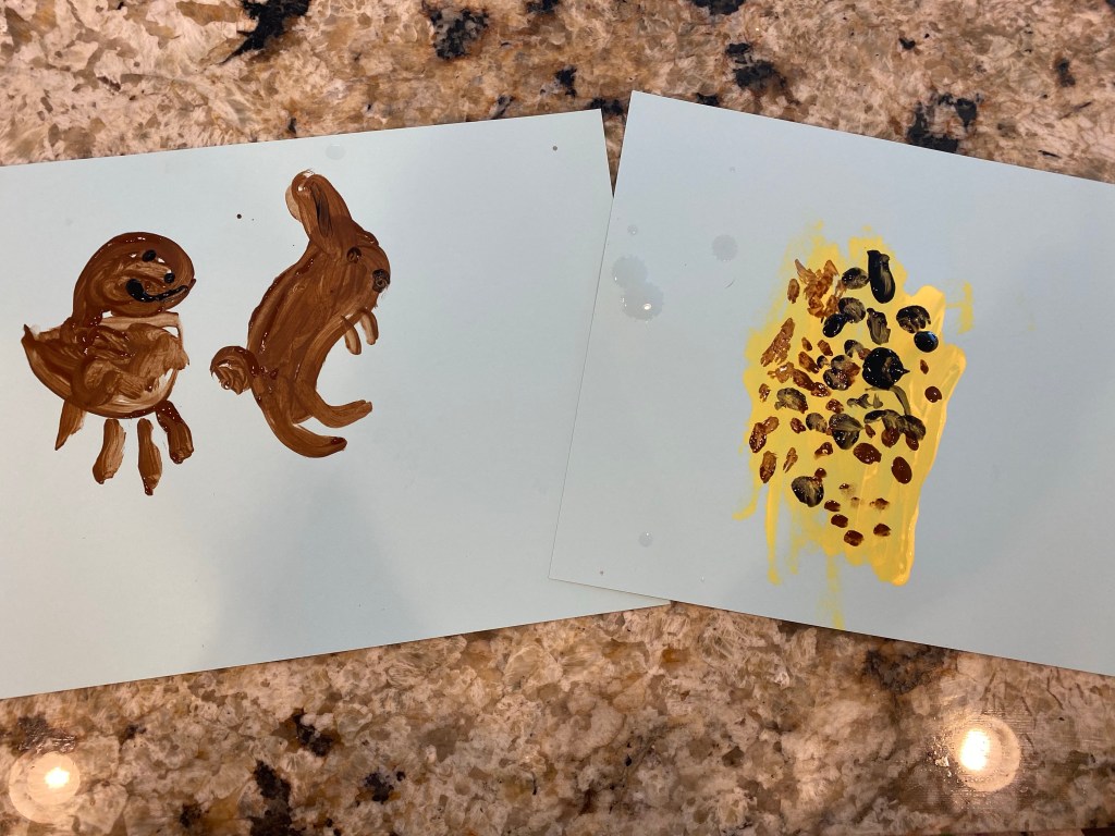 -Favorite animal painting: I had my littles think of their favorite animal, then paint it. My 5 year old painted a bunny (with help) and a brown duck, my 3 year old painted a speckled bird.