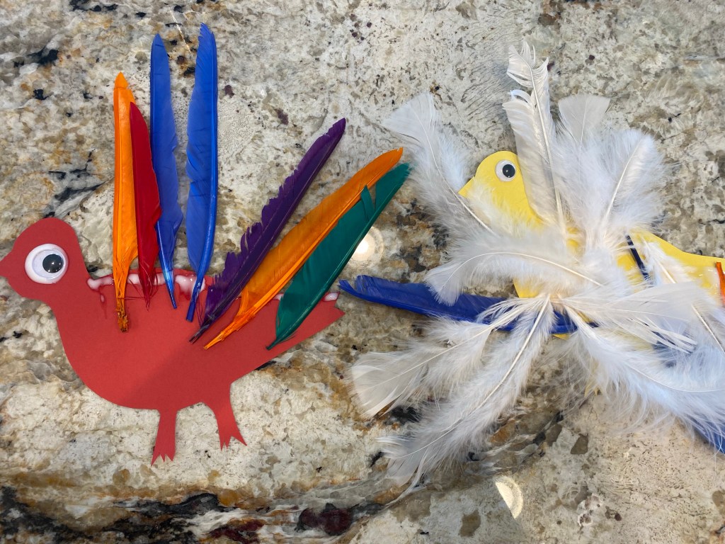 -Birds have feathers craft: I cut out some birds for my littles then had them glue feathers on them. As they worked I explained the different types of feathers birds have using the ones on the table- downy feathers to keep the bird warm, and stiffer flight feathers to help the bird fly.