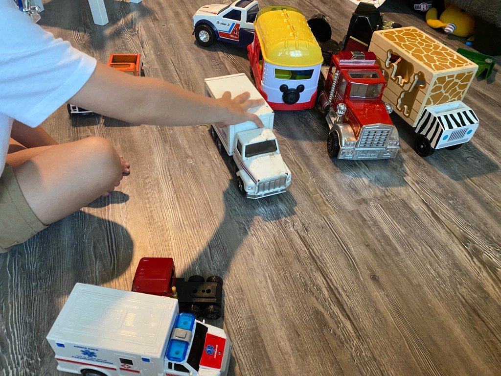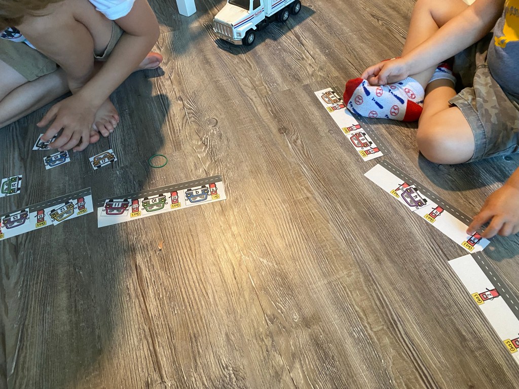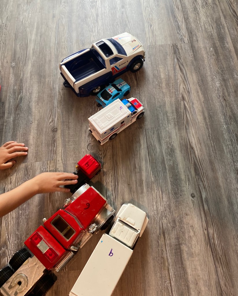 -Vehicle sorting: I gave my littles a pile of random road vehicles and had them sort how they chose. My 5 year old sorted by size, and my 3 year old by color.
