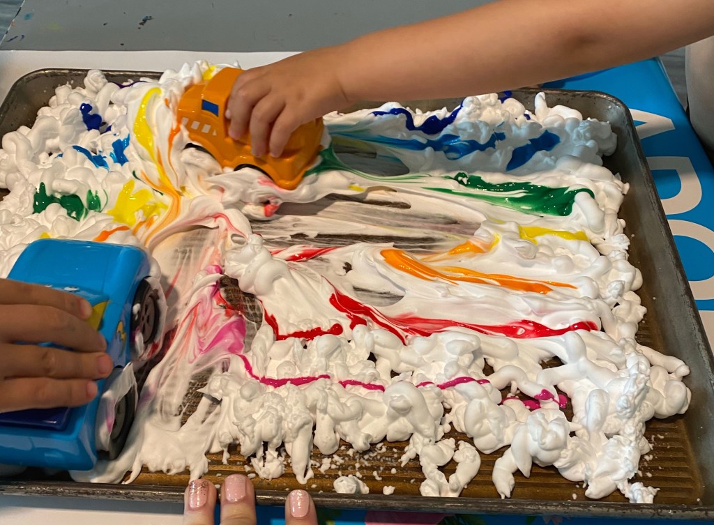 -Car color mixing: I squirted some paint (check out this AMAZING Crayola paint set I got on Amazon for $30! 12 bottles that are each 16 ounces…its going to last me foreverrrrr! LoL Sorry I’m super excited! It’s a way better deal than 12 1 ounce bottles for $12!) into a sheet pan covered with shaving foam and had my littles drive cars through it to mix the paint colors and explore. I got this idea from PreK Pages.