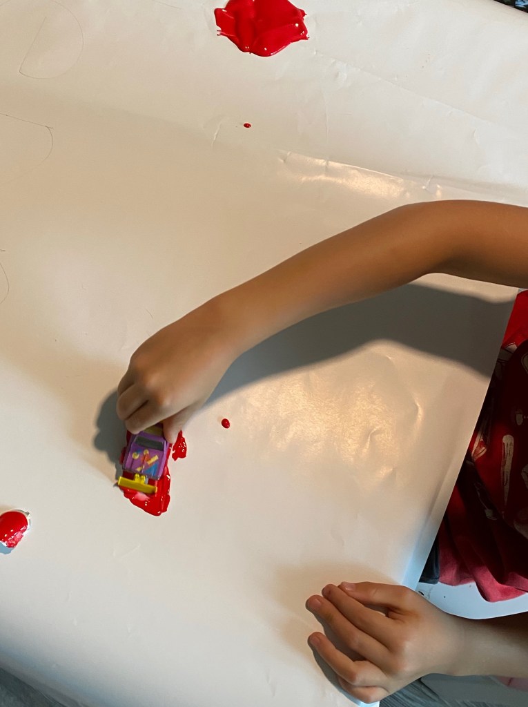 -Write your name with cars: This was a bit tricky, even on huge paper, but my littles still enjoyed it! For my 3 year old I wrote his name in large letters then had him drive his car through the paint then use it to drive on the letters to paint his name. I had my 5 year old try driving his own letters, but he ran out of room so maybe write their name first even if they’re a bit older!