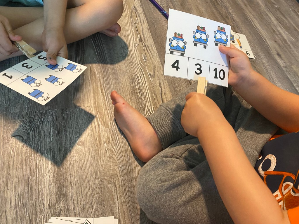-Road trip count and clip: I printed these road trip count and clip cards from Fluffy Tots, then laminated them and had my 3 year old work on the 1-3 cards and my 5 year old work on the rest…ie. they counted each item and clipped the correct number.