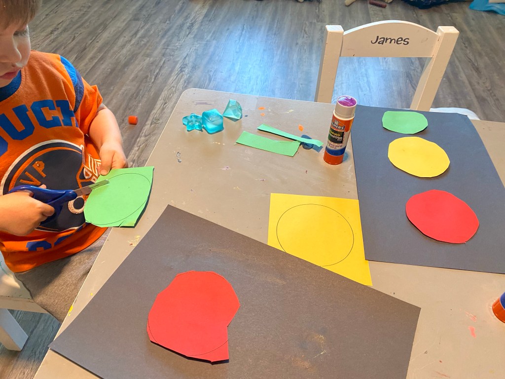 -Traffic light geometry: We reviewed circles and rectangles, then I had my littles cut out a green, yellow and red circle and glue them to a black triangle to make a stop light. We also went over what each color means just for fun!