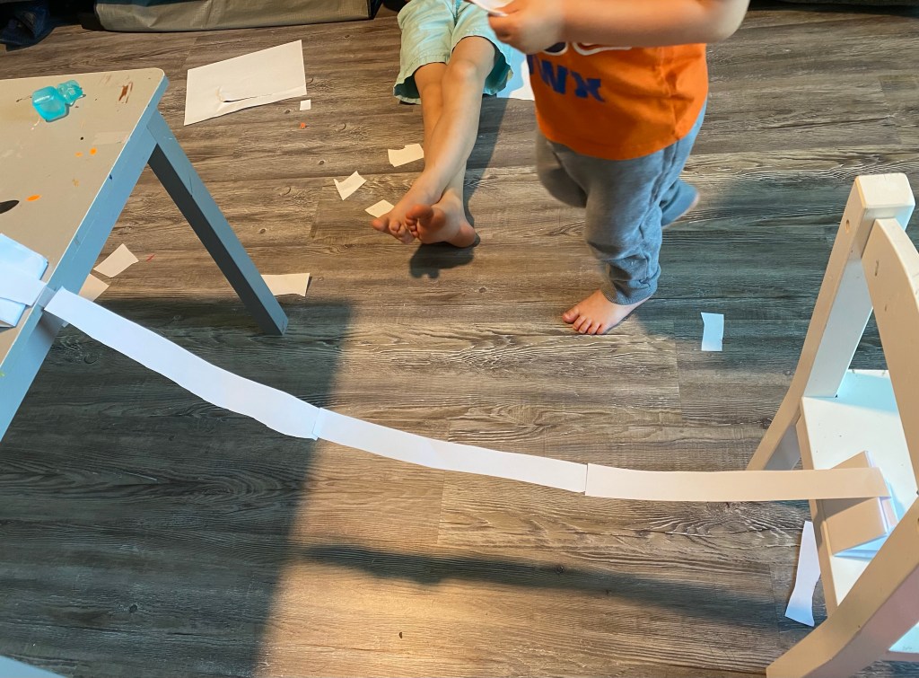 -STEM bridge building challenge: I gave each of my littles 3 pieces of paper, 6 inches of tape and some scissors, along with the task to build the longest bridge they could between our school table and their chair.