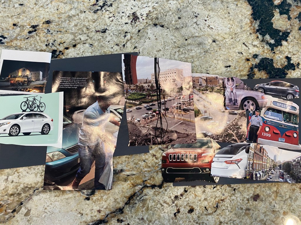 -Vehicle collage: I gave my littles some old magazines along with the task to find and cut out cars and trucks. When they had a good stack, I had them glue the pictures to black paper to make a collage.