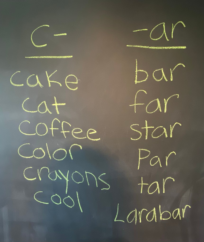 -C- and -ar word families: I had my little brainstorm words that start with c and end with the -ar sound! I wrote them on the board, but you could also have your little do the writing.