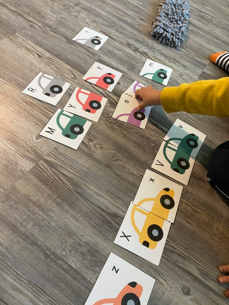 -Car letter match up: I printed this car ABC match from Activity Mom then laminated it and had my littles match upper to lower case.