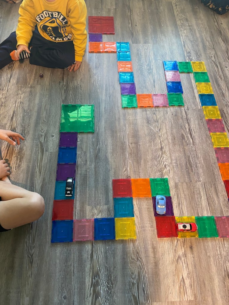 -Build your own racing game: We used our Picasso Tile set for this, but Magnetiles or Post-it notes would also work! You just make a gameboard with the tiles, then take turns rolling dice (we used a 10 sided dice but you could do 2 traditional dice and have your little add them) and moving your matchbox car that many tiles. Whoever reaches the end of the track first wins! I got this from Everyday Chaos and Calm.