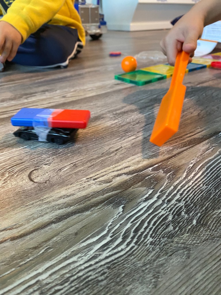 -Ramp texture experiment: We built a ramp using a bin and a cookie sheet, then tested 3 different cars on it, marking where each car landed with “cookie sheet”. Next we covered it with a paper towel and tested them again, this time marking the landing spots with “paper towel”. We did the same thing with a kitchen towel and a fuzzy blanket. Then I asked my little to look at the data (all the places the cars landed) and come to a conclusion about the ramp surfaces- ie. How does the ramp surface effect how far the car travels? He rightly concluded that the fuzzier the surface, the more friction there is and the harder it is for the wheels to turn, so the car doesn’t go as far. Great job scientist!